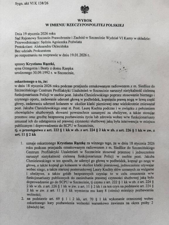 Znieważył, naruszył nietykalność cielesną funkcjonariuszy, a także wywierał wpływ na czynności urzędowe, za swoje zachowanie odpowiedział przed Sądem