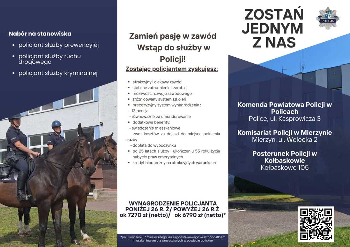 Jeżeli jesteś zainteresowany służbą w Policji i chcesz w przyszłości pełnić służbę jako funkcjonariusz, zapraszamy do kontaktu. Dokumenty możesz złożyć w Komendzie Powiatowej Policji w Policach pod adresem 72-010 Police, ul. Kasprowicza 3, w Komendzie Wojewódzkiej Policji w Szczecinie pod adresem 70-515 Szczecin, ul. Małopolska 47, bądź w innej jednostce Policji. Może to właśnie na Ciebie czekamy.