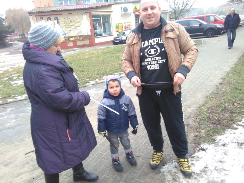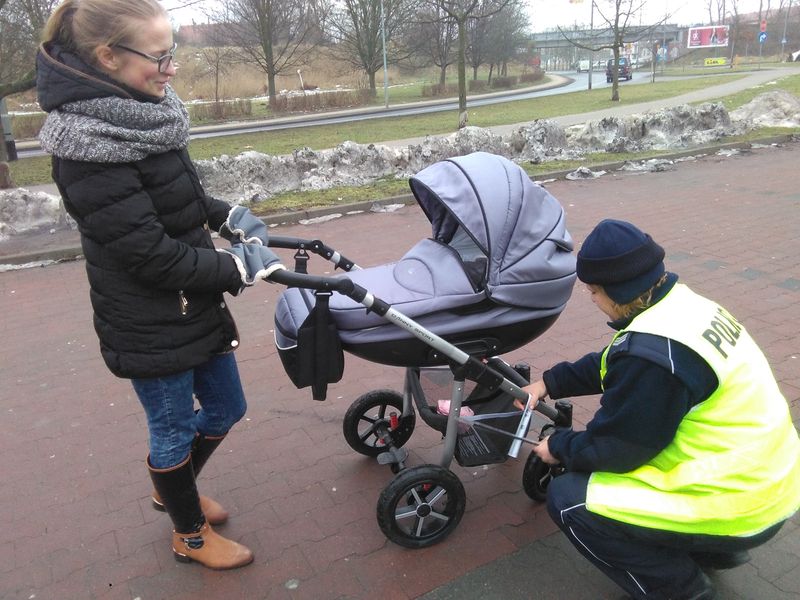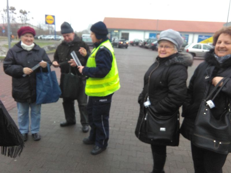 „Pieszy na drodze zgodnie z prawem idzie lewą” - umieszczony napis na samozaciskowych opaskach odblaskowych został wykonany przez znakomitego, polskiego rysownika satyrycznego Henryka Sawkę. Przez cały dzień funkcjonariusze Policji rozdają takie odblaski pieszym. w akcję włączyły się szkoły i Powiat Policki.